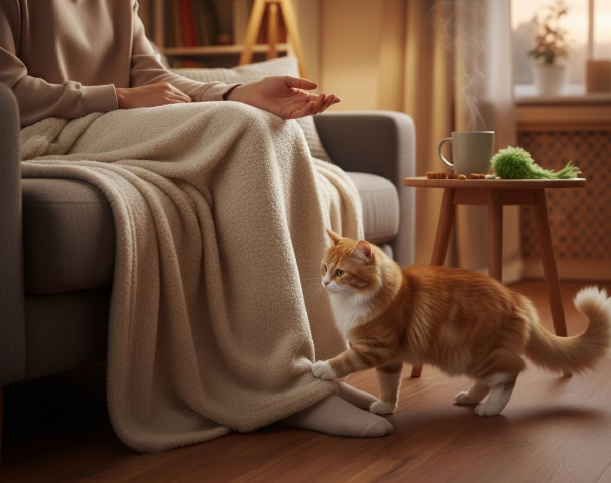 Cosy blankets invite laps, creating spots for comforting behaviour in cats and natural cat companionship.